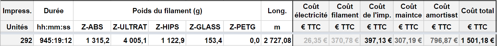 En deux ans, j’ai dépensé environ 310 € TTC pour l’ensemble des pièces, accessoires et buses que l’on pourrait qualifier de frais de maintenance. Cela ne me paraît pas scandaleux, par rapport au prix d’acquisition de l’imprimante, bien que cela aurait été inacceptable pour une imprimante 2D classique.
