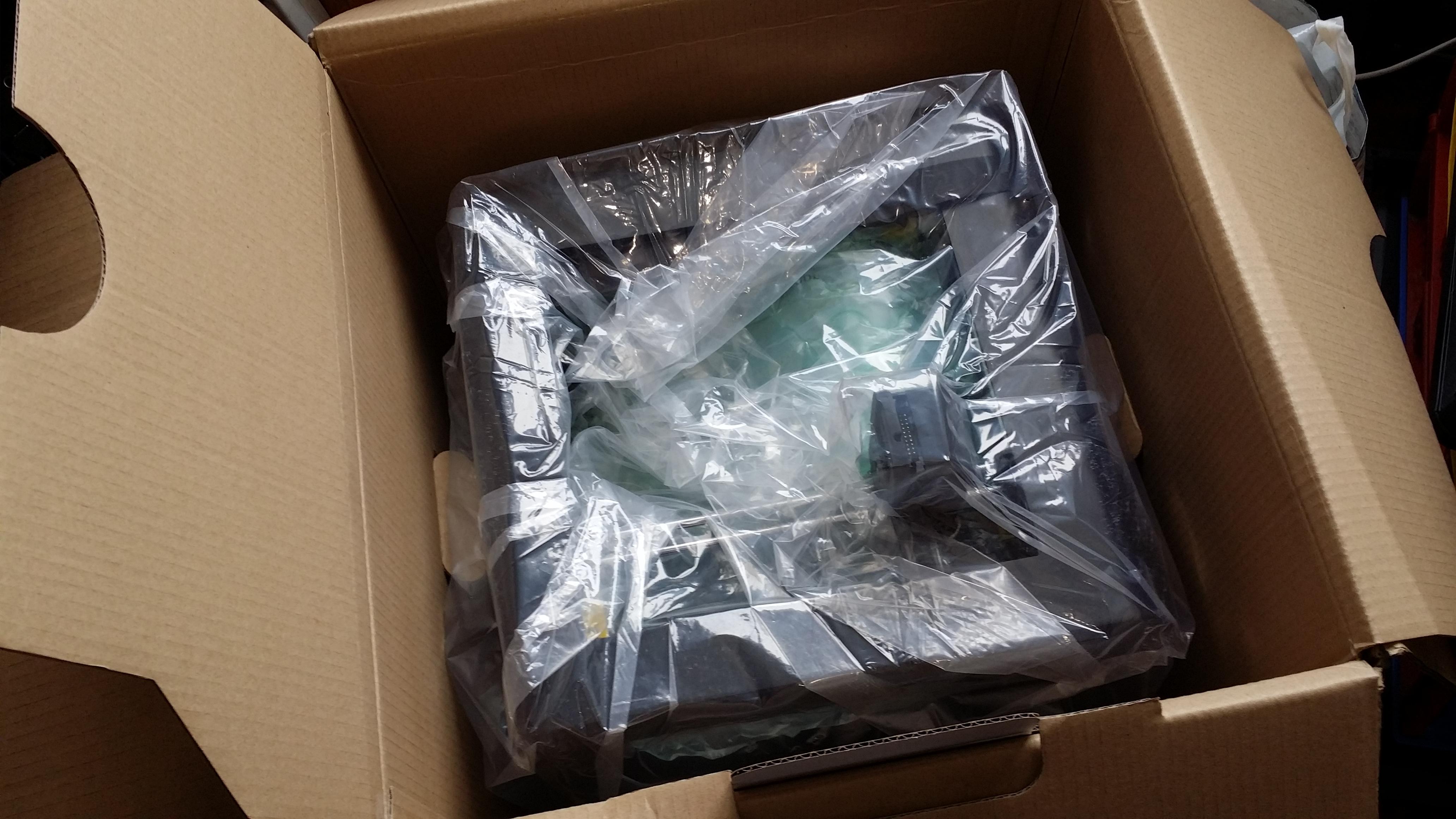 À l’intérieur du carton, l’imprimante est très convenablement protégée. D’une part, par une seconde couche de carton. D’autre part, par un rembourrage de type polystyrène. Enfin, par un film plastique.