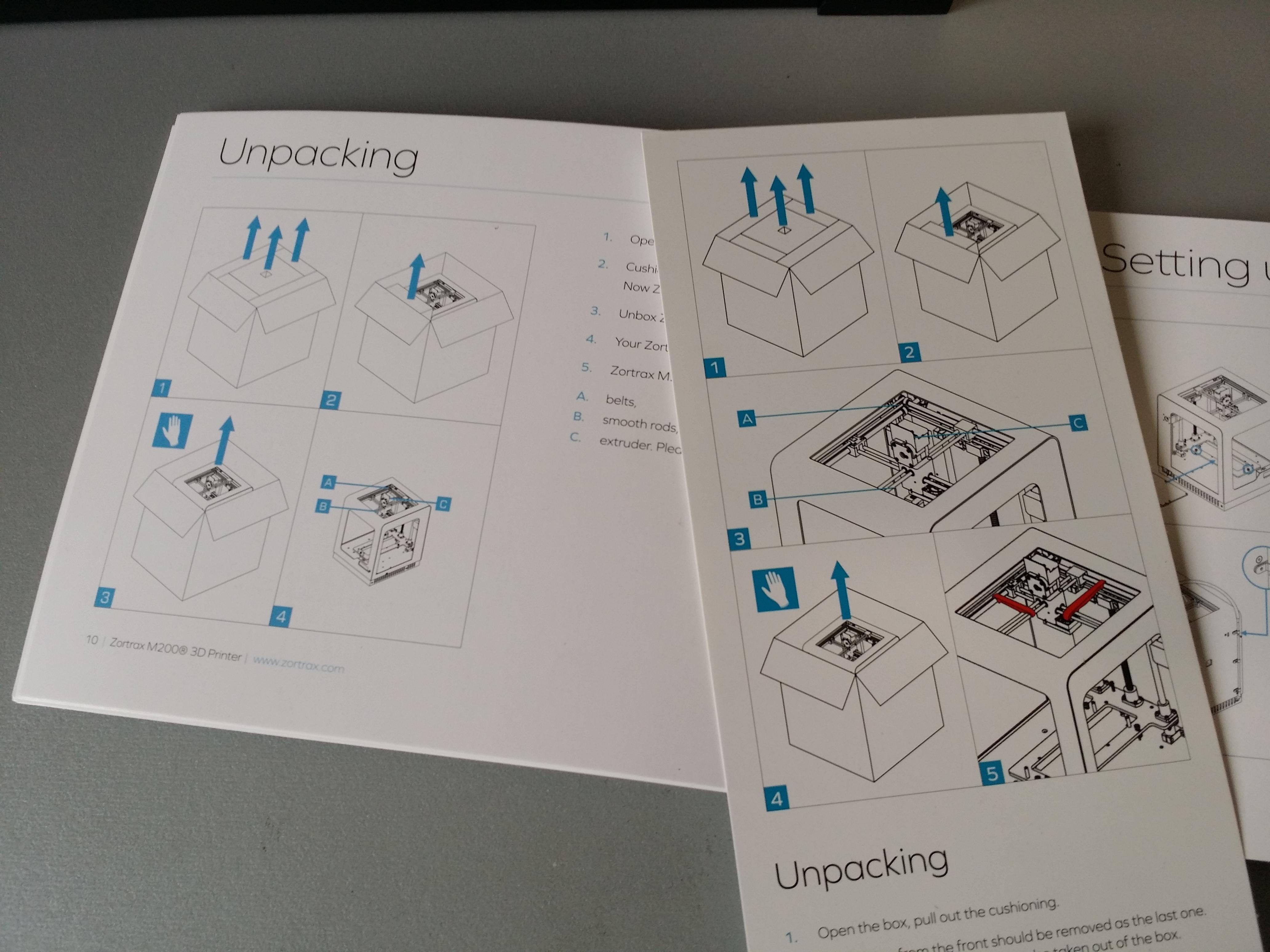 En plus de l’imprimante, du câble d’alimentation, du plateau chauffant et d’une bobine de filament propriétaire Z-ABS blanc, le carton contient une liste des pièces incluses, un dépliant d’aide au déballage et d’installation, une documentation cartonnée du plus bel effet, tous en anglais, ainsi qu’un épais livret multilingue faisant office de contrat de garantie.