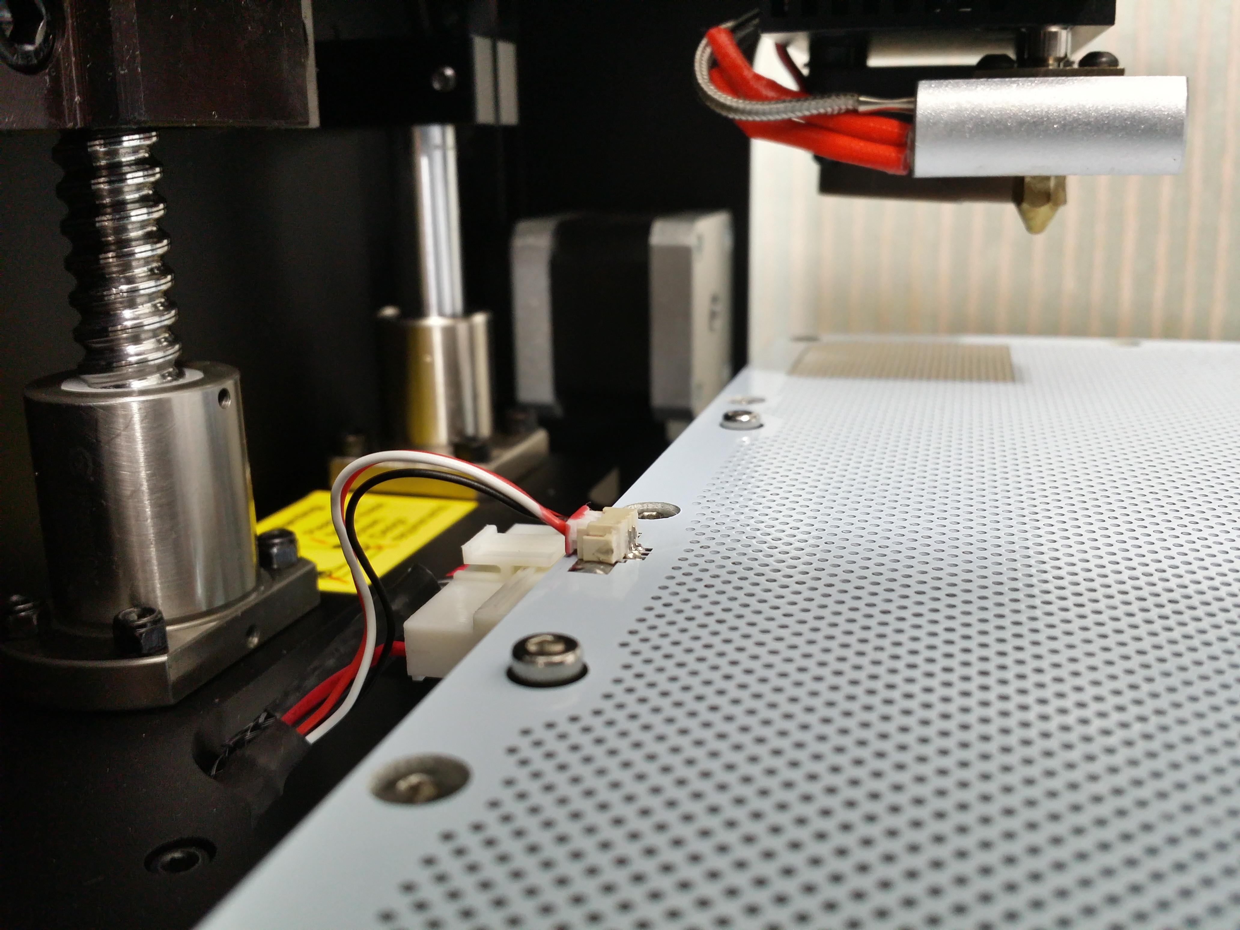 L’installation du plateau chauffant fait découvrir l’étonnante connectique de celui-ci. En effet, celle-ci se trouve au fin fond de l’imprimante, et, une fois les panneaux latéraux (optionnels) installés, seules les ouvertures en façade et sur le dessus permettent d’y accéder de manière très inconfortable. Les câbles étant trop courts pour réaliser la manipulation hors imprimante, la manipulation est juste pénible. Or, il s’agit de sortir et rentrer le plateau après chaque impression, le décollage de la pièce imprimée du plateau d’impression se faisant hors imprimante. Un défaut de conception gênant.