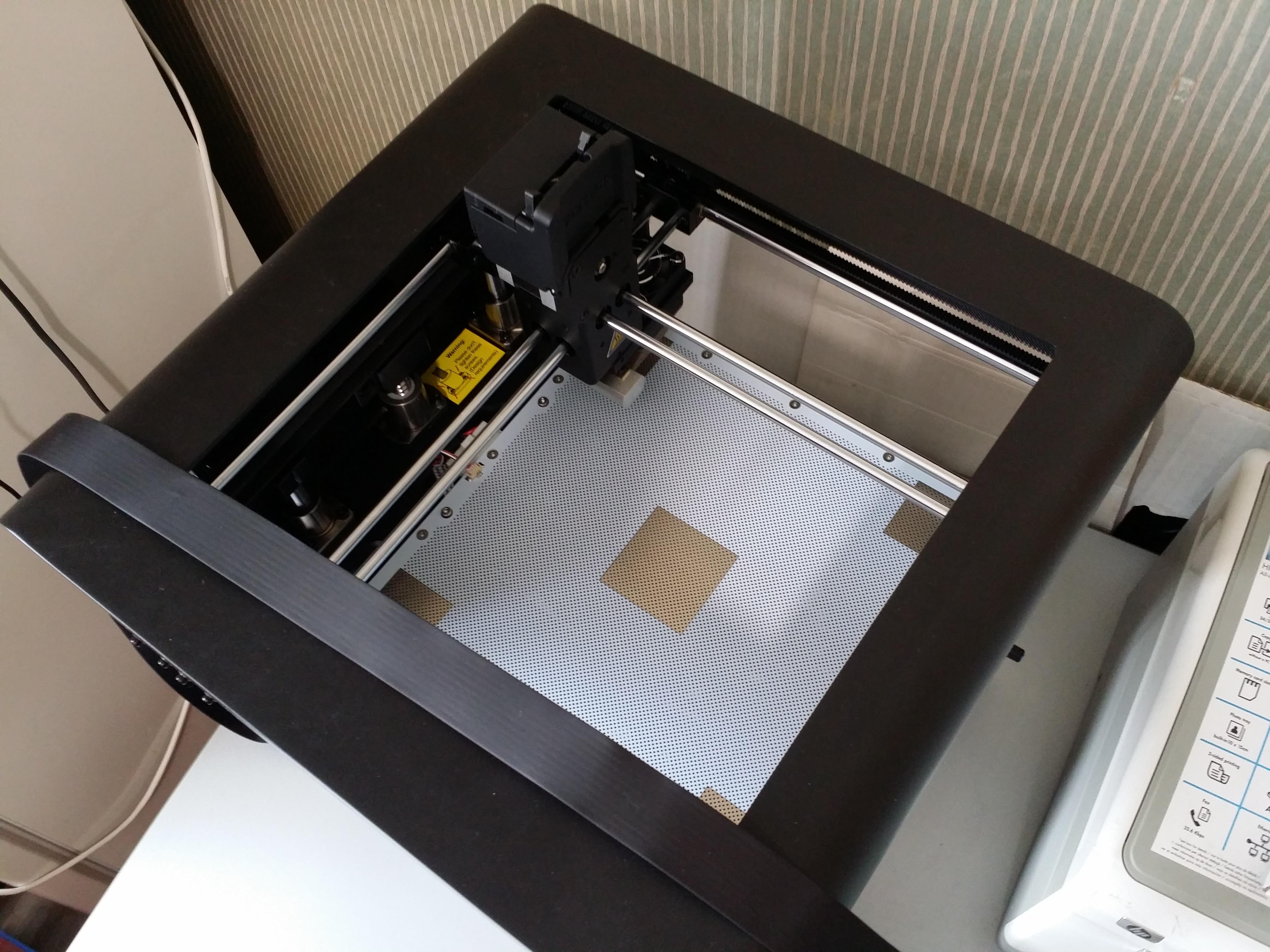 Pour finir l’installation de l’imprimante elle-même, il faut encore installer le filament fourni, ainsi que calibrer le plateau. Ici, ce fut un cauchemar, pour moi. Malgré une douzaine d’heures d’essais intensifs, je n’ai pas réussi cette étape de calibrage. Ce n’est alors que j’ai vérifié le plateau, pas parfaitement plat. Même si le site de support du constructeur ne prévoit pas cette procédure pour le plateau chauffant de seconde génération (plateau chauffant épais), il est possible de le redresser en faisant bien attention à ne pas forcer pour ne pas l’abîmer. Cependant, même non parfaitement calibrée, l’imprimante imprime convenablement. Le calibrage n’en reste pas moins utile pour une impression optimale.