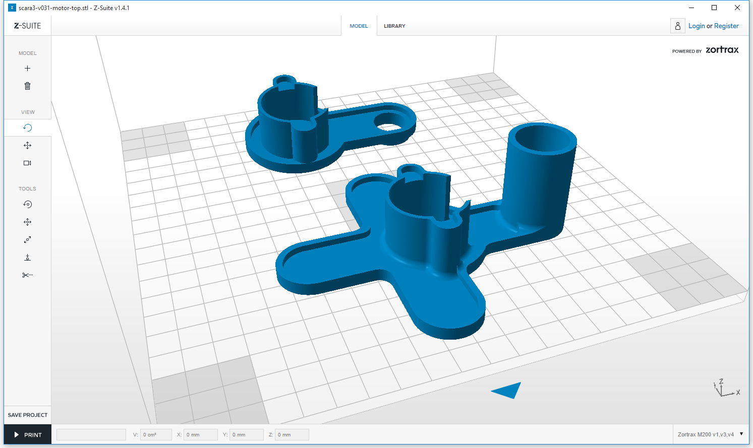 Une fois l’imprimante installée, il faut encore télécharger le logiciel d’impression, Z-Suite. Z-Suite est un outil ayant deux fonctions. D’une part, la préparation des fichiers d’impression aux caractéristiques de l’imprimante et du filament, ainsi que des préférences d’impression. D’autre part, l’accès à la bibliothèque des modèles fournis par les autres utilisateurs d’imprimantes Zortrax. Le principal objet de l’outil reste l’import de modèles et l’enregistrement du fichier de commandes à transmettre à l’imprimante sur carte SD. Les standards de fait de l’industrie 3D sont gérés, à savoir les formats de fichiers STL, OBJ et DXF.