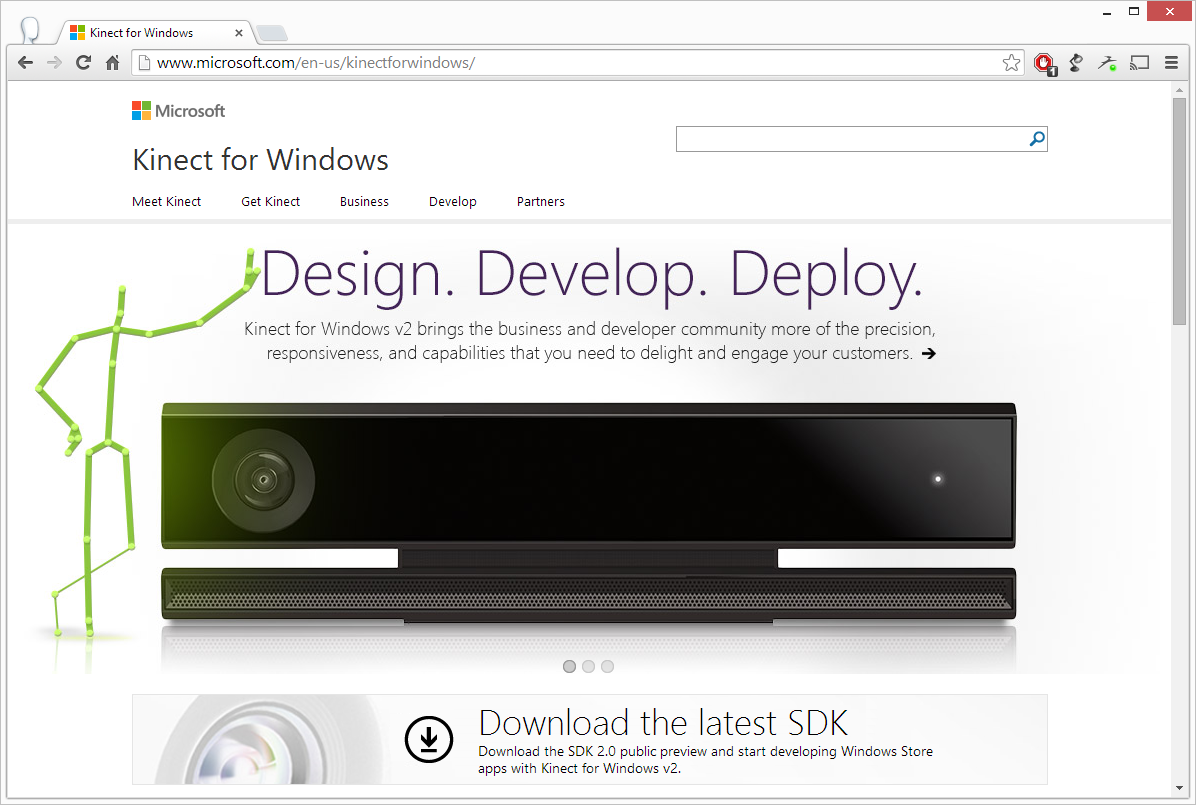 Capture d'écran du site web officiel Kinect for Windows